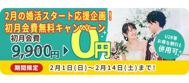 通常は9,900円/月の月会費ですが、キャンペーンの適用により初月分の会費が無料で利用できます!まずは、登録料(6,600円)だけで活動を始められるため、婚活費用も大幅に節約できるでしょう。